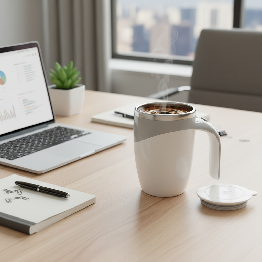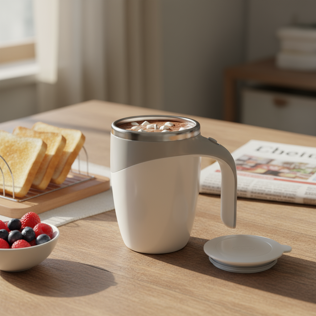 Praticidade e inovação em uma caneca que mistura automaticamente sua bebida e mantém a temperatura por mais tempo.