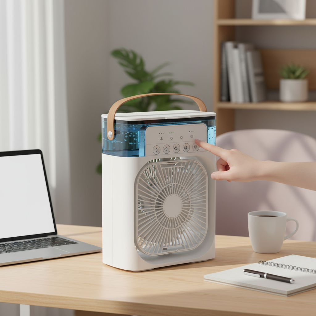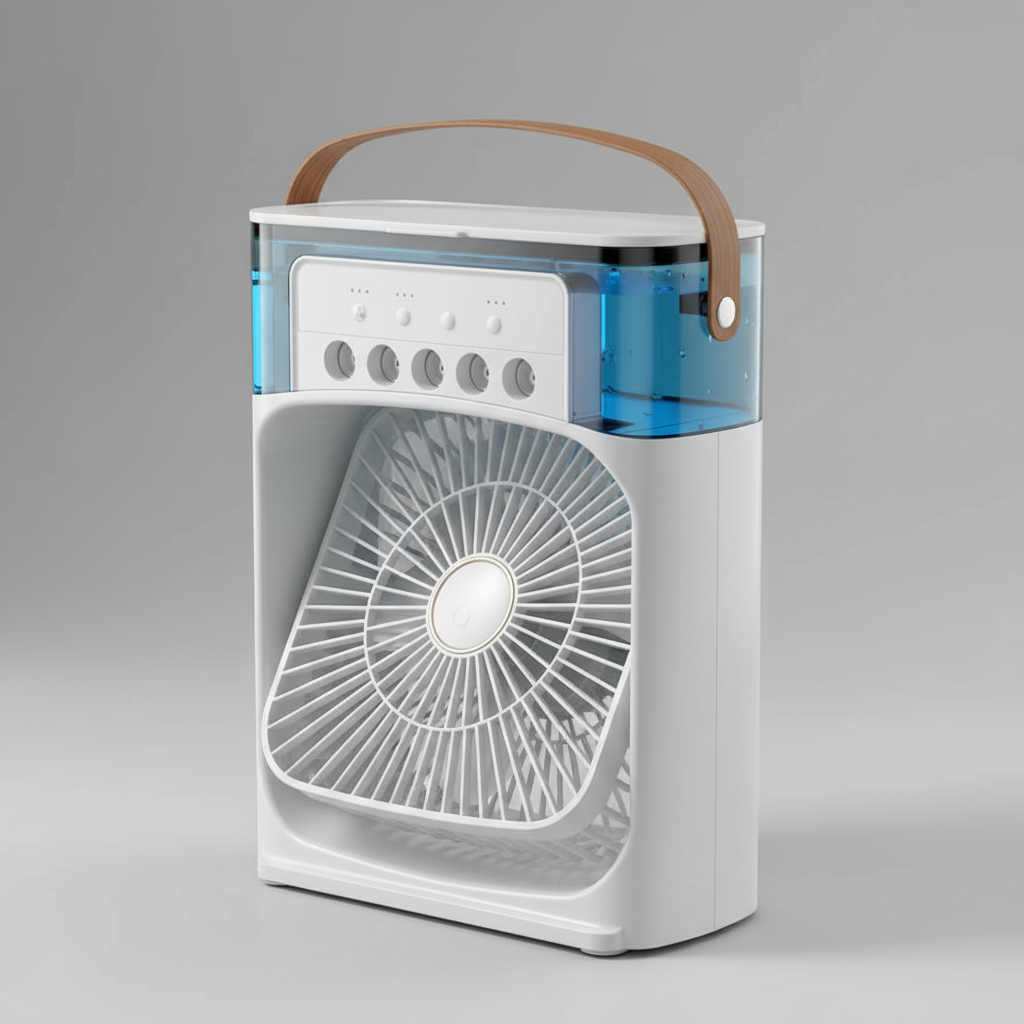 Ventilador, umidificador e aromatizador em um único aparelho.
