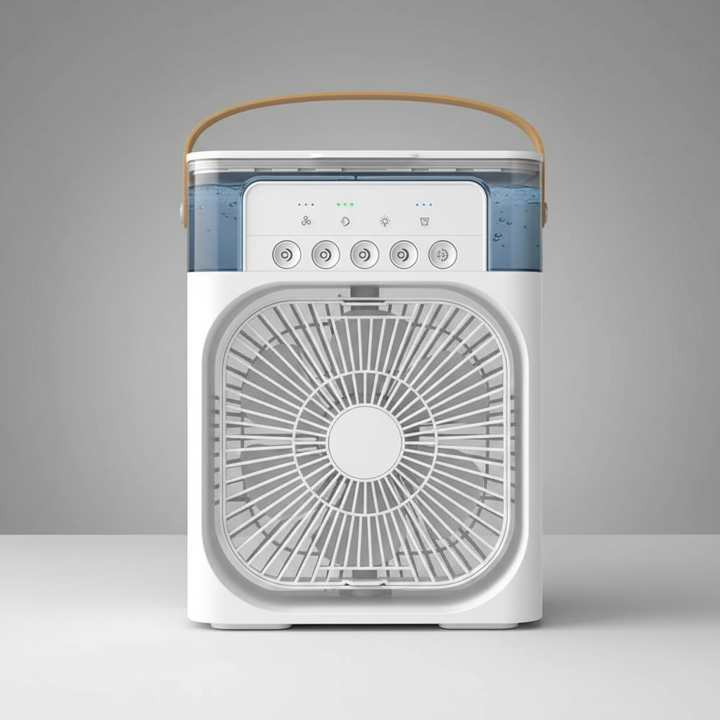 3 em 1 com Ventilador, umidificador e aromatizador em um único aparelho. Adicione agua e gelo para resfriar e trazer de volta a humidade rapidamente